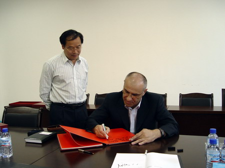 经理姚军教授(左)请库尔巴诺夫院士为威廉希尔WilliamHill题词