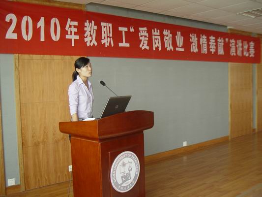 校工会2010年教职工“爱岗敬业,激情奉献”演讲比赛于2010年9月20日在工科楼B座学校会议室举行。本次比赛,青岛校区共有八个单位参赛。参赛者结合自身工作实际,以深沉炽热的情感,用真实、生动感人的事例,反映了在和谐校园建设中广大教职工爱岗敬业,默默奉献的职业道德和奋发向上建功立业的崭新风貌。