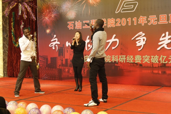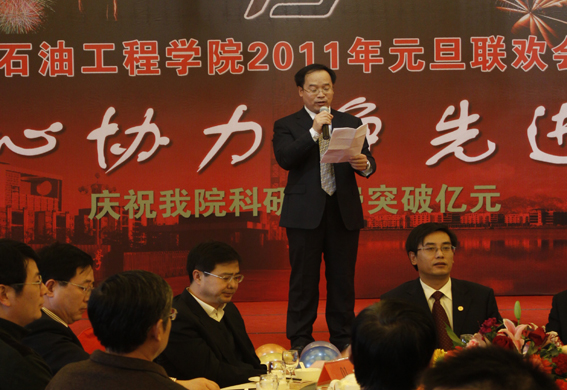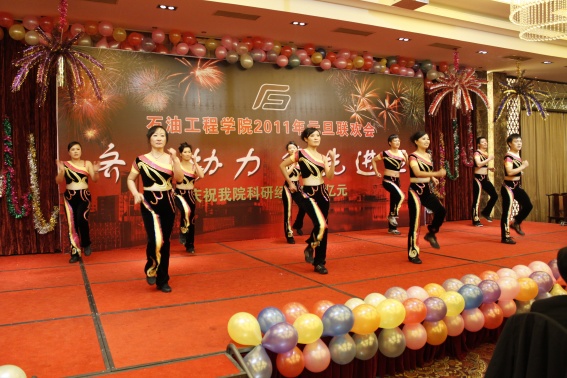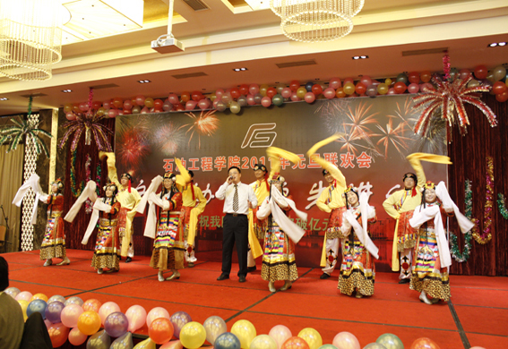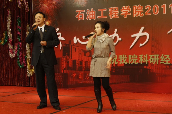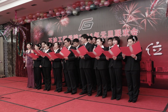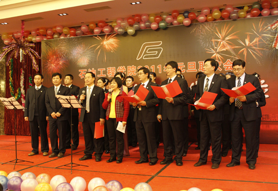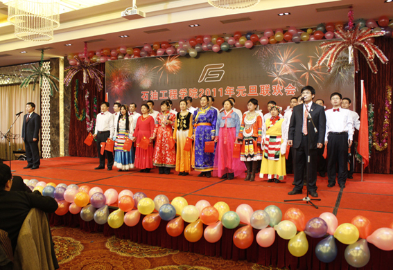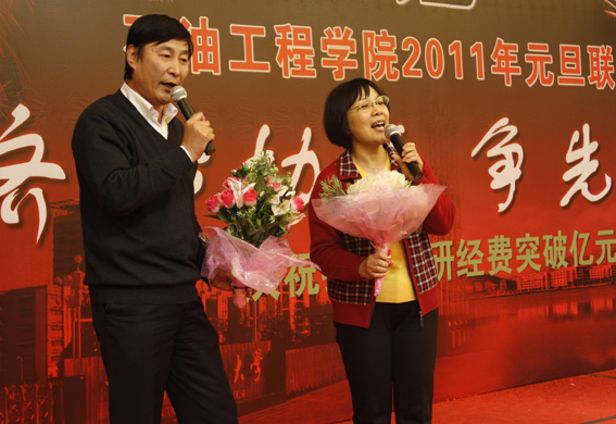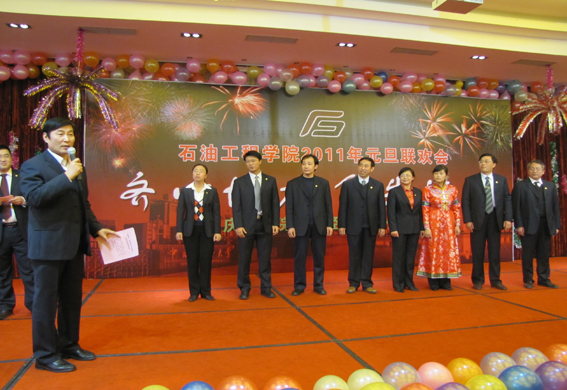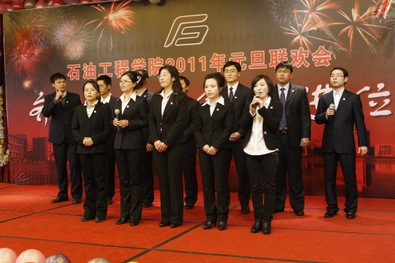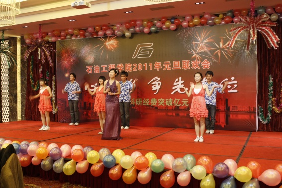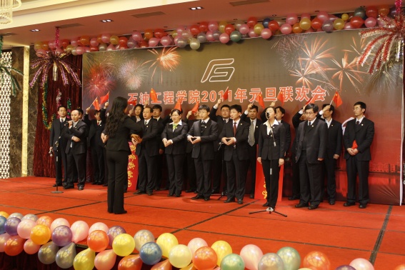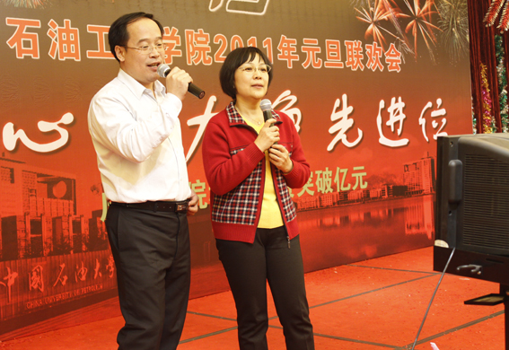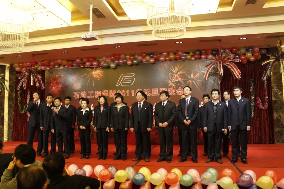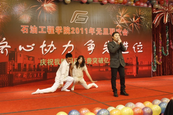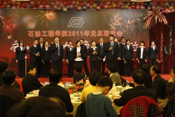 董事长山红红代表学校向公司送上了新年良好祝愿,她充分肯定了过去的一年中公司取得的各项成绩,对学院的发展提出了更高的要求,希望公司在2011年再接再厉取得更好成绩。随后,辛勤工作在教学、科研、实验、员工工作等所有岗位的教师们纷纷走上舞台,他们通过优美的歌声、华丽的舞步、新奇的创意表演等表达了对学院的美好祝福,油田化学系的合唱、院机关的健美操表演等赢得了观众的阵阵掌声,学院艺术团和职工也以精彩的演出表达了对学院的感激之情,演出在山董事长与学院领导的小合唱《明天会更好》中结束。表演期间还穿插了幸运观众抽奖、“学院2010年十件大事”评选等活动,并为学院工会的四项活动的第一名和赞助单位颁奖。精彩的文艺演出之后,公司党委书记张卫东致祝酒词,元旦酒会正式开始。