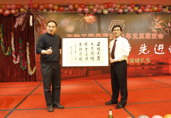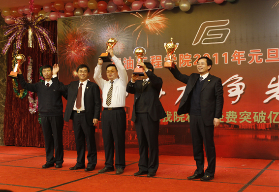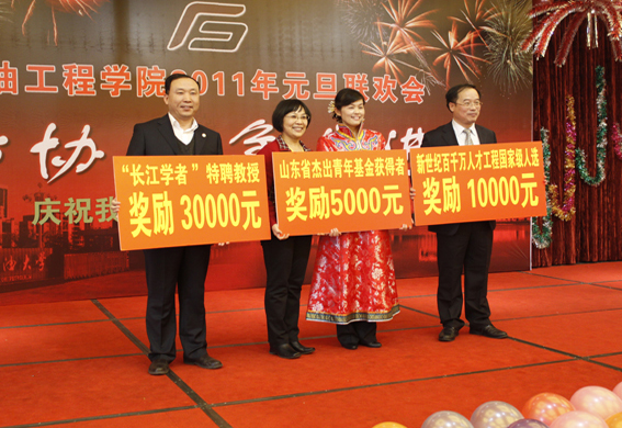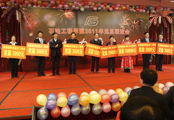 联欢会对2010年度为学院做出贡献的教职工代表进行了颁奖,高层次人才、国家及省部级科技成果奖、国家及省部级精品课程、个人科研经费超过500万元的教师、山东省优秀博士论文、老员工科技活动优秀指导等50位教职工代表上台领奖。山董事长、王瑞和副董事长、杨茂椿董事长助理等上台宣读颁奖词并未获奖者颁奖。“科研就是创新,在这条道路上,充满了攀登的艰辛,也充满了探求的乐趣、攀登总有风险在,花开却在峰顶处”,副董事长王瑞和向国家级、省部级科研成果奖获得者颁奖时如是说。