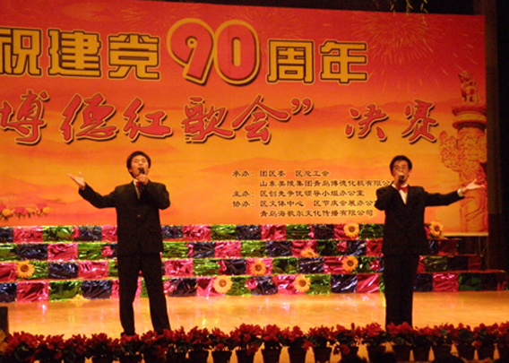 4月19日,由青岛市开发区创先争优领导小组办公室主办,由团区委、区总工会、山东美菱集团青岛博德化机有限公司承办的庆祝建党90周年“红歌嘹亮、青春飞扬”红歌会决赛,在滨海学院礼堂成功举办。公司师生代表学校参赛并取得优异成绩。