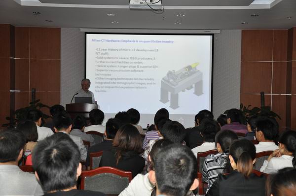 报告中,Wolf Val Pinczewski教授介绍了他的主要研究方向,并重点分析讲授了通过微观CT方法建立三维微观孔隙网络模型的过程及其模拟分析效果等。Wolf Val Pinczewski教授用了形象的动画深入浅出的描述了三维微观孔隙网络模型在研究微观渗流机理方面的优越性。讲座之后,Wolf Val Pinczewski教授与公司师生进行了互动,就目前处于前沿领域的数字岩心技术做了交流和探讨。