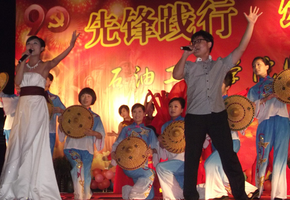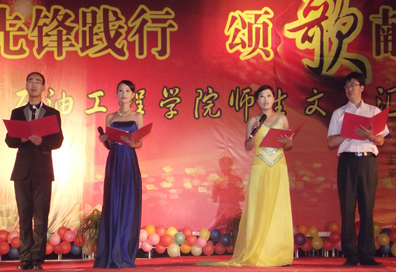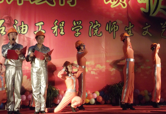 今年以来,石工学院遵照“明德、笃信、励志、图强”的院训,立足专业特色,创新形式和内容,深入开展了特色鲜明的庆祝建党90周年主题教育活动。6月,公司党委与“中央企业先进基层党组织”胜利采油厂22队党支部结成共建对子,开展“携手共建、先锋同行”活动。双方党组织强强联手、相互促进,共同弘扬行业文化和行业精神,共同推进党政管理、队伍建设和文化建设。此次演出作为庆祝建党90周年的一项重要活动,胜利采油厂22队也特别带来了诗朗诵《七月颂歌》、歌伴舞表演,并赢得了观众们的热烈掌声,它标志着两个先进基层党组织“携手共建,先锋同行”活动的全面展开。
