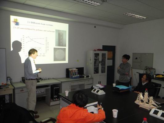 Paul Stevenson 博士介绍了的主要研究方向,并重点讲授了泡沫基础理论、泡沫在矿物浮选和提高原油采收率中的应用,并与现场师生交流互动,解答了大家关心和困惑的问题。报告会后,Paul Stevenson 博士实地参观了学校泡沫流体研究中心,并与李兆敏教授课题组尽心了交流研讨。
