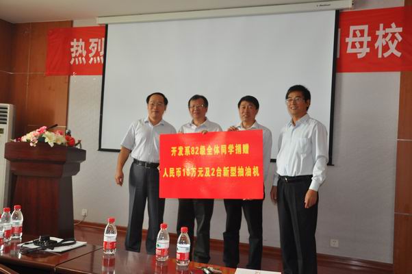 10月2日,钻井78级的员工从德州出发齐聚公司,在学院大厅举行了毕业三十周年聚会活动,并向学院捐赠“981海洋钻井平台模型”,中石油副总经理汪东进在代表员工们感谢母校母院的培养,并对近年来学院所取得的成绩表示由衷的祝贺,无论员工们身在何处都将时刻关心、大力支持学院的发展。10月4日开发82级员工在学院报告厅举行座谈会,共叙同学情谊,表达对学院的关心与支持,捐赠10万元及双驴头、宽带式抽油机各一台。