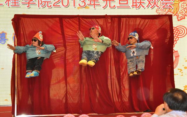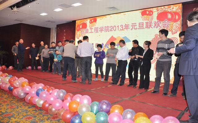 随后,教职工们表演了形式多样、丰富多彩的文艺节目。在舒缓流畅的音乐里,油藏工程系教师们衣着华丽的民族特色服装,以开场舞《好日子》欢庆新年,带来喜悦与美好的祝福;歌曲串烧之后,歌伴舞《东北家人》独特的唱腔,精湛的表演让人彷佛置身于静谧的乡野之中;风采青春,魅力舞台,由团委表演的《江南Ssyle》热情奔放,活力四射,博得满堂彩;三句半《一年四季》、木偶剧《双簧舞蹈》、吕剧《马大宝喝醉了酒》等节目精彩纷呈,绚烂夺目;趣味游戏中,姚军、李爱芬等三对夫妇获得最有默契奖,现场观众报以热烈的掌声。歌曲《一杯美酒》唯美动听,真切动人;石工艺术团现场助兴,带来精彩的舞蹈《山鹰之邦》慷慨激越,乐观向上;歌伴舞《让我们舞起来》大气喜庆,最后将现场气氛推向高潮。联欢会进行过程中,还穿插了元旦“大乐透”抽奖环节,让现场观众惊喜连连。