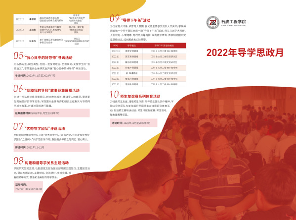 黄维安在导学思政月活动方案中介绍,为积极营造“教学相长、师生相宜、团队共建、和谐美好”的优良导学氛围,围绕学术科研、个人生活、职业发展等三个层面,公司面向所有导师和研究生,设计了党的二十大精神学习宣讲、研究生导师导学思政能力提升培训、“能源报国·能源强国”思想引领专题教育、研究生学术沙龙、寻访“我心目中的好导师”、征集展播“我和我的导师”故事、评选“优秀导学团队”、构建和谐导学关系主题党团活动、导师下午茶、师生友谊赛系列体育活动等十类活动内容。