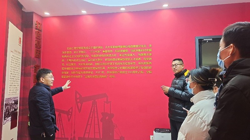 黄维安首先从“红色基因·家国情怀”部分讲述,以年份和照片相穿插的方式集中呈现了不同历史时期学院师生爱党爱国、砥砺奋进的动人画面,展现了一代代石工人在“我为祖国献石油”的精神感召下,书写的“为中国加油,为民族争气”的辉煌篇章。党支部的同志们热情高涨,神采飞扬,对本次参观学习活动满怀热切。