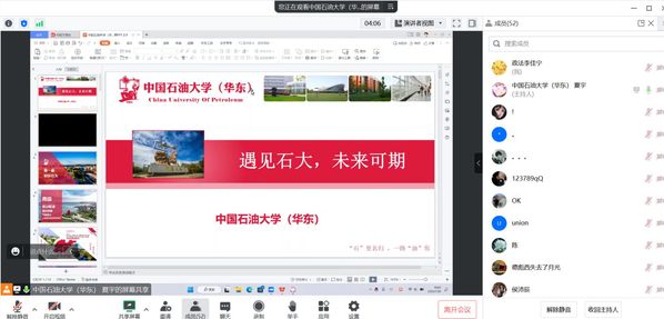 结合当前疫情防控形式,队员积极与母校相关人员进行对接,联合中国政法大学、吉林大学宣讲队组成高校联合宣讲团,利用钉钉、腾讯会议等平台,于1月26日对昌邑市文山中学进行了线上宣讲。宣讲活动由队长夏宇担任主讲,结合个人在石大的学习与生活体验,多角度对石大进行了讲解,积极为中学母校师生答疑。直播宣讲期间,学校共有二百余人在线观看,师生及家长反响热烈。通过线上宣讲,母校的优秀学弟学妹纷纷表示,今年将报考石大,圆自己名校梦,为学校和家庭争光。