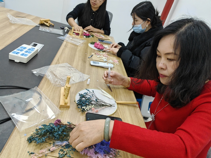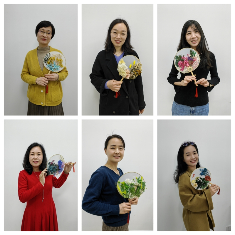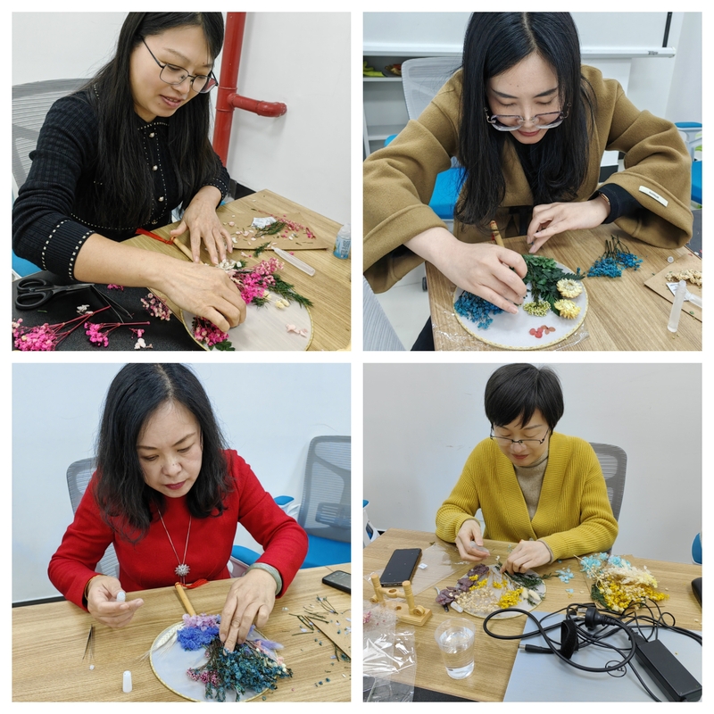活动中,女老师们尽情发挥创意和想象力,将干花摆放在团扇上面,然后用胶水一步步耐心而仔细将其固定在团扇的位置,待干花粘贴固定在团扇后,一幅幅魅力的干花团扇便制作完成了。在活动现场中女老师们互相观摩,互相学习,气氛融洽。