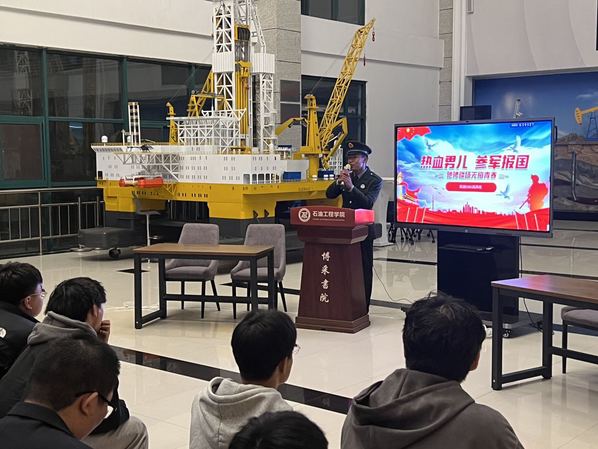 【本站讯】为增强老员工的国防观念和家国情怀,弘扬参军爱国的正能量,4月4日,海油1902团支部联合石工2003团支部、海油2101团支部于工科楼B座大厅开展了以“热血强军梦,踔厉正青春”为主题的团日活动。本活动邀请了高泽政、宋佳佳两位退伍老员工,由海油1902班班长刘云霆主持,各团支部全体成员参加。