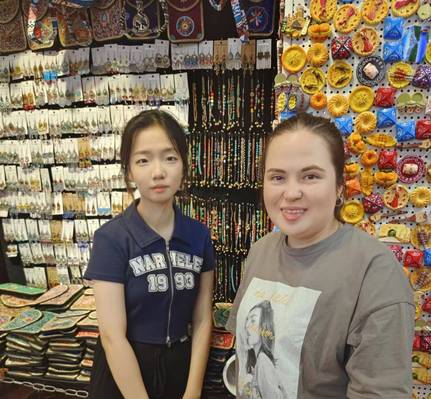 实践队成员在国际大巴扎与店主合影 崔跃钟摄