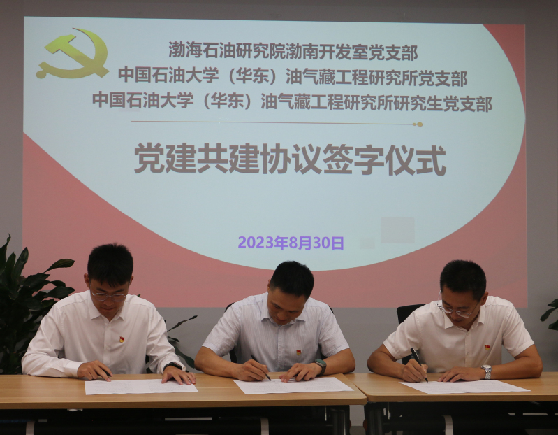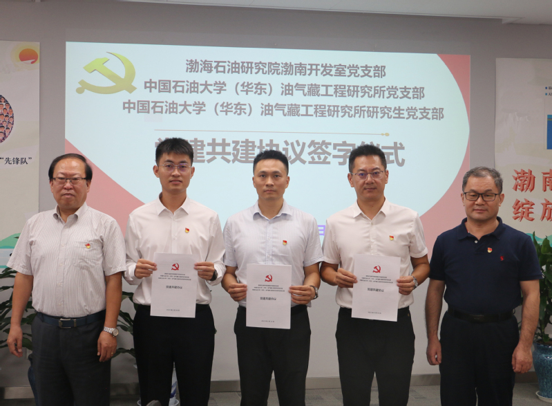 中国海油集团公司专家、渤海石油研究院开发研究一所党总支书记、所长马奎前同志对学院教师和研究生的到访表示热烈欢迎,高度评价了学院教学科研及人才培养等工作,希望通过此次共建活动提升各支部的党建水平,推进双方的高质量发展。渤南开发室党支部书记李超、油藏所教工党支部书记李亚军和研究生党支部书记王青龙分别介绍了各支部的基本情况,分享了党建工作经验和特色做法。李超同志针对支部在党员教育、组织生活、年轻职工培养等方面的工作进行了介绍,分享了科室所涉及的主要生产和科研业务。李亚军同志汇报了油藏党支部在主题教育、特色党建、业务成果、推进创新性工作等方面的典型做法和工作经验。王青龙同学汇报了党支部在主题党日、员工党员培养、学风建设、志愿活动等方面的成功经验。随后,三个支部围绕人才培养、科技创新、成果转化、实践实习、职业发展等方面深入交流研讨。最后,三个支部签署了党建共建协议并合影留念。