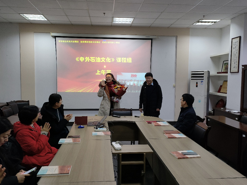 首先,课程组全体成员一同观看了林英松教授授课影集,回顾了过去3年来,林英松教授在《中外石油文化》课程上获得的国家课程思政教学名师、国家课程思政示范课程、教师教学创新奖、校教学成果奖等6项奖励,以及作为副主编完成《中外石油文化》教材编写的辛勤付出。齐宁副经理向林英松教授送上了鲜花,感谢她为一流课程建设做出的贡献。