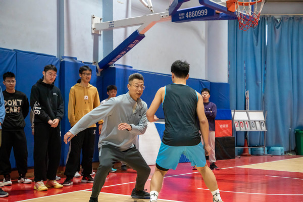 理论讲解之后,牟老师带着同学们进行了科学的热身,做好剧烈运动之前的热身,能够让运动员们做好心理和生理准备,提升运动表现,最大程度减少运动损伤。稳定的核心和脚步重心变换是篮球协调性的主导,在基本的热身活动结束后,牟老师进行了篮球专项脚步灵敏性与爆发性的无球教学,将启动、滑步、急停、跨步、转髋等脚步移动技术详细地向同学们展示,让同学们在球场上能够提升脚步上的优势,从而能够带来更多的得分机会和轻松投篮的机会。随后牟老师将同学们聚到一起,近距离展示了投篮时的各项技术要点,将前面学习的脚步训练与投篮训练相结合,进行模拟实战投篮的进阶训练,详细展示了跨步投篮、后撤步投篮等技术细节。在课程的最后,牟老师组织同学们进行了3v3篮球实战展示,讲解了一些在比赛中常见的战术。