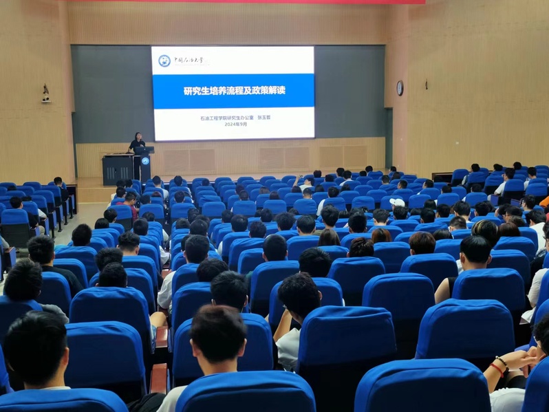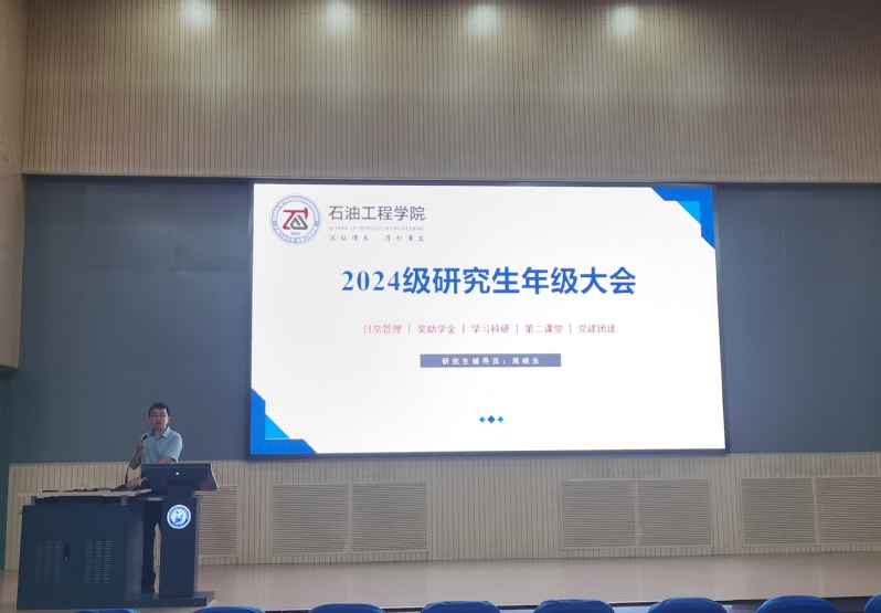 会议伊始,张玉哲解读了培养流程及政策,详细讲解了课程学分认定及成绩转化、开题、中期考核、毕业成果、学位申请等公司产品流程,带领新生熟悉研究生教学培养各个环节,希望同学们从入学开始做好研究生学涯规划,遵守学术道德,保证高质量完成各项环节。SPE员工分会负责人2024级研究生刘泽宇从组织基本情况、品牌活动、成长平台等方面,介绍了SPE员工分会的建立、发展和工作计划,并邀请优秀同学加入SPE员工分会。随后,研究生辅导员周晓东介绍了学校学院发展历史沿革、学科实力、科研平台和团队力量等,鼓励同学们借助高平台、产出高水平成果;对于研究生日常事务管理,周晓东讲解了学校纪律规定、学院研究生管理要求、宿舍及工作室管理等内容,重点讲解了研究生奖学金评定、员工党员发展等员工关心的事项;在安全教育环节,周晓东提醒同学们务必遵守安全管理规定和要求,防溺水、防意外、防诈骗、防火防盗,保障人身财产安全;周晓东希望全体新生在学习科研中践行“家国同心,艰苦奋斗,惟真惟实,追求卓越”的石大精神,不断追求卓越、勇攀高峰。