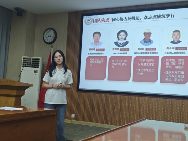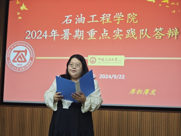 活动伊始,各团队答辩人依次上台结合PPT,通过视频、图片、动画的形式,围绕实践策划、团队介绍、实践内容和感悟分享等多个方面对此次暑期社会实践活动作详细展示。各团队在实践过程中都注重根据实践对象的特点来设计实践内容,石榴花开实践队积极践行铸牢中华民族共同体意识,以实际行动促进各民族交流交融;红迹实践队重走长征路,追寻红色足迹,传承革命精神;科左后旗碧野兴乡实践队聚焦乡村振兴,为乡村发展注入青春活力;耀石之辉实践队深入感悟老一辈石油精神,展现新时代青年对石油行业的担当;校级重点实践队“泰州星火 碳路先锋”走进油田一线和科技前沿,参观学习,体悟石油精神的深刻内涵。