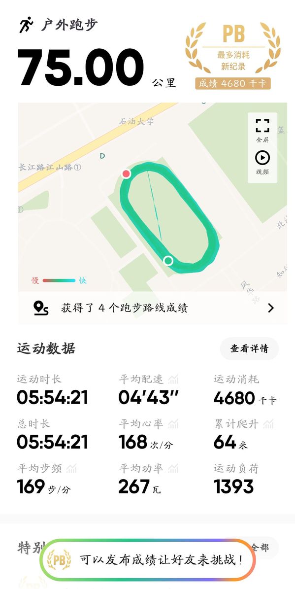 此外,学院中长跑队在学校操场开启了一场激情澎湃的挑战——75公里接力跑,以独特而豪迈的方式迎接国庆75周年的光辉时刻!员工们在操场上挥洒汗水,用时5小时54分完成了75公里的目标,用坚实的脚步丈量每一寸土地,用汗水书写对伟大祖国的祝福。黄一涵、王文淇、刘釜源等18名队员依次出发,如同璀璨的石油花绽放在校园的赛道上。