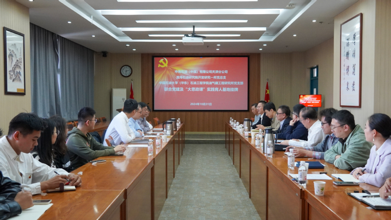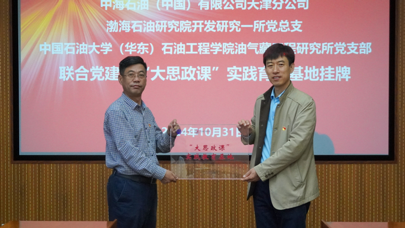 【本站讯】为进一步贯彻落实党的二十大、党的二十届三中全会精神及习近平总书记对能源行业、油气领域的重要指示批示精神,不断增强基层党组织政治功能和组织功能,探索党建资源共享、党建经验互学、党建活动共办的党建联建共建新模式,10月31日,油气藏工程研究所党支部、油气藏工程研究所研究生党支部与中海石油(中国)有限公司天津分公司渤海石油研究院开发研究一所党总支开展联合党建活动,签署党建共建协议,举行“大思政课”实践教育基地挂牌活动。渤海石油研究公司党委副书记、工会主席滕玉波,中海油集团公司专家、开发研究一所所长、党总支书记马奎前,开发研究一所渤南开发室副主任、党支部副书记吴穹螈来院交流,石油工程公司党委书记张展,专职组织员张乐勇,油气藏工程研究所党支部和研究生党支部党员代表参加本次联合党建活动。活动由油气藏工程研究所党支部书记李亚军主持。
