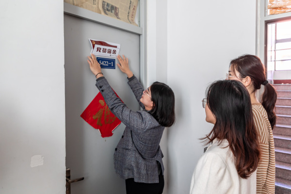 张贴标识展形象。师生们走进各宿舍楼张贴标牌,共同为员工党员宿舍进行挂牌。挂牌过程中,党员同志们心情激动,表示一定做到“一名党员就是一面旗帜,一间宿舍就是一座战斗堡垒“。辅导员叮嘱同学同时提出建议,挂牌只是一个契机,希望党员同志与宿舍同学一起,创建好党员宿舍,推动宿舍文化,树立宿舍特色,如建设”无烟宿舍“、”无游戏宿舍“、”运动型宿舍“等等,由点带面促进整体精神风貌。