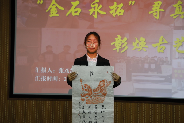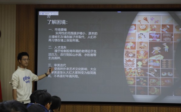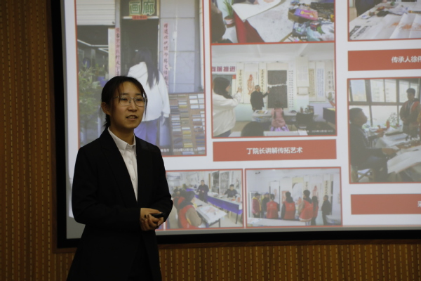 中期验收现场,学员们以各实践队代表答辩的形式,将探索成果生动呈现。答辩台上,代表们借助图文并茂的PPT、精心剪辑的视频资料,将与传承人的交流点滴、实地调研的艰辛与收获娓娓道来。 在实践展示板块,晨曦寻年实践队成果尤其令人惊叹。调研胶南年画的过程中,邀请传承人联合学院开展“博采金课”活动,让更多同学们了解了胶南年画,有力促进了非遗文化的传承与发展。其次,金石永拓队则在徐氏拓印调研时,做到了实践进校园,实行社区与学校联合的模式,更好传承与发扬非遗文化,真正做到了实践在身边,行动在当下。