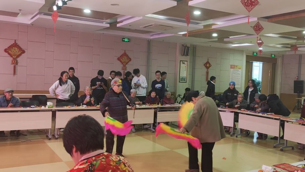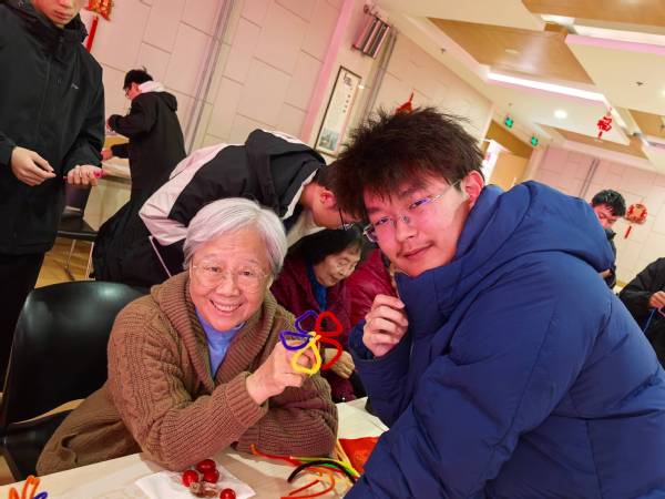 在中康颐养护理院,首先进行福字拓印DIY,支部成员帮助老人们将印版固定在红纸上,向他们介绍该如何用刷子将颜料抹在印版上;第二部分是用扭扭棒制作各种小饰品,如花环、中国结,眼镜等。支部成员们化身耐心的导师,一步一步向老人们展示如何用扭扭棒制作,老人们纷纷手拿扭扭棒,认真学习,积极制作。在制作的过程中,本研(石)2302团支部成员申博文给在场的老人演唱一首水中花,石工(卓越)2408团支部刘釜源和黄成也给老人们带来即兴舞蹈,年轻的舞姿激起老人们心中的热情,他们戴上支部成员制作的花环和眼镜,为现场的观众带来了一场扭秧歌,欢乐在此刻洋溢。