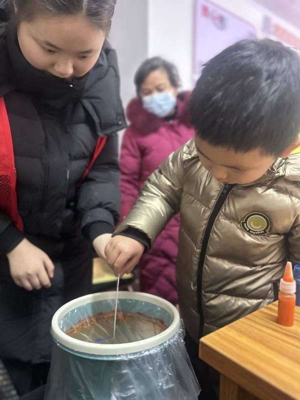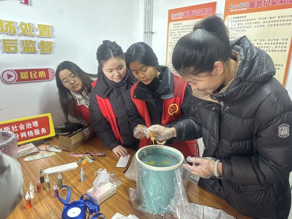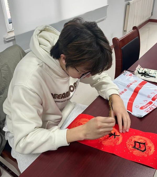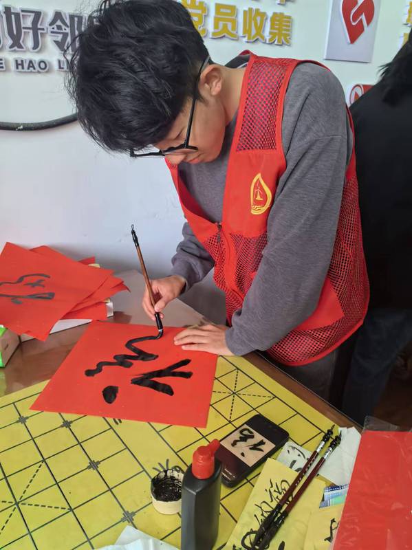 活动伊始,书法展示环节便吸引了众多目光。本研(石)2401团支部贾镇宁以其书法特长,在现场展示了书写“福”字的过程,赢得了居民们的阵阵掌声,增添了节日的喜庆气氛。与此同时,漆书签制作区也异常热闹。支部成员们耐心指导社区的小朋友们大胆地在书签上涂抹色彩和勾勒图案,展现出他们的创意和想象力。最后,支部成员们将提前准备好的礼品分发给参与活动的居民,同时将新春的温暖与欢乐传播到每一位参与活动的居民心间。
