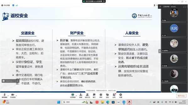 【本站讯】新学期伊始,为切实增强员工安全意识,推动班级建设与学风建设,引导员工迅速调整状态投入学习生活,2023级各班通过线上线下结合的形式召开了“开学第一课”主题班会,同时学院召开班长支书与团总支会议,为新学期筑牢基础、指明方向。