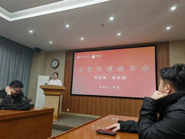 活动进入了第二部分——“石油魂”宣讲团宣讲环节。此次宣讲团共邀请了韩雪、刘智睿两位宣讲人,二人分别以《铁人跳泥浆》和《五把铁锹闹革命》为主题,为支部成员带来了一场生动的石油精神教育课。