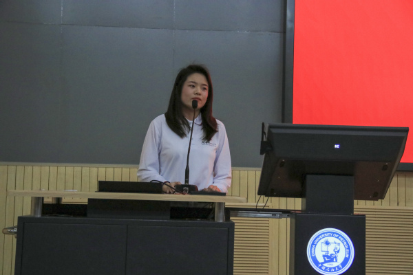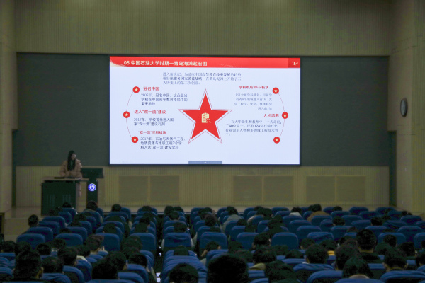 宣讲团讲成员甘洛铭以“石油大学的来时路“为主题,用“京郊建家园”“东营谋发展”“青岛起宏图”三个篇章串联起学校与共和国石油工业同频共振的发展历程。当讲到石大先辈在盐碱滩上搭建“干打垒”校舍时,海油2401班员工李治霖表示“此时此刻脚底下得校园土地似乎更加厚重,我们一定要像先辈那样,高擎能源报国旗帜,将能源的饭碗牢牢端到自己手里!”