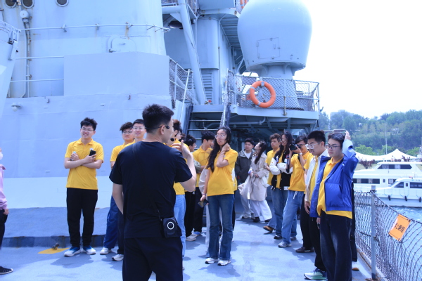 ,实践团登上刘公岛景区退役驱逐舰。作为我国自主研发的第一代导弹驱逐舰,该舰艇服役30余年,航迹遍布祖国海疆,见证了中国海军从“黄水”到“蓝水”的跨越。 队员们实地观摩主炮(130毫米口径)、副炮(双管37毫米舰炮)、导弹发射架等武器系统,聆听其在捍卫领海主权中的实战故事。 随行老师结合甲午战争惨败教训,对比当下海军装备现代化成果:“从‘致远舰’的悲壮到驱逐舰的列装,百年海防史印证了‘科技强则国防强’的真理。站在甲板上,队员们远眺刘公岛海域,员工代表薛浩然感慨:“军舰的每一道锈迹都是历史的刻度,我们要以更强的责任感守护国家海洋权益。”