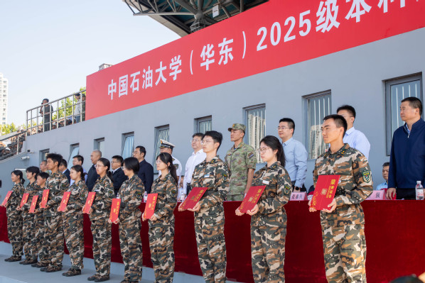 【本站讯】9 月 20 日,公司 2025 级员工军训总结表彰大会在学校体育场盛大举行。公司党委书记吴强明,副董事长周鹏,党委副书记马国顺,党委常委、宣传部部长赵放辉,中国人民解放军海军某部队上校赵刚,军训旅旅长、中国人民解放军海军某部队少校王冰,国防教育工作领导小组成员以及各院部负责人出席典礼。吴强明向中国人民解放军海军某部队赠送锦旗。石工学院 2025 级全体参训学子以饱满状态全程参与,展现出独特的学院风采。
