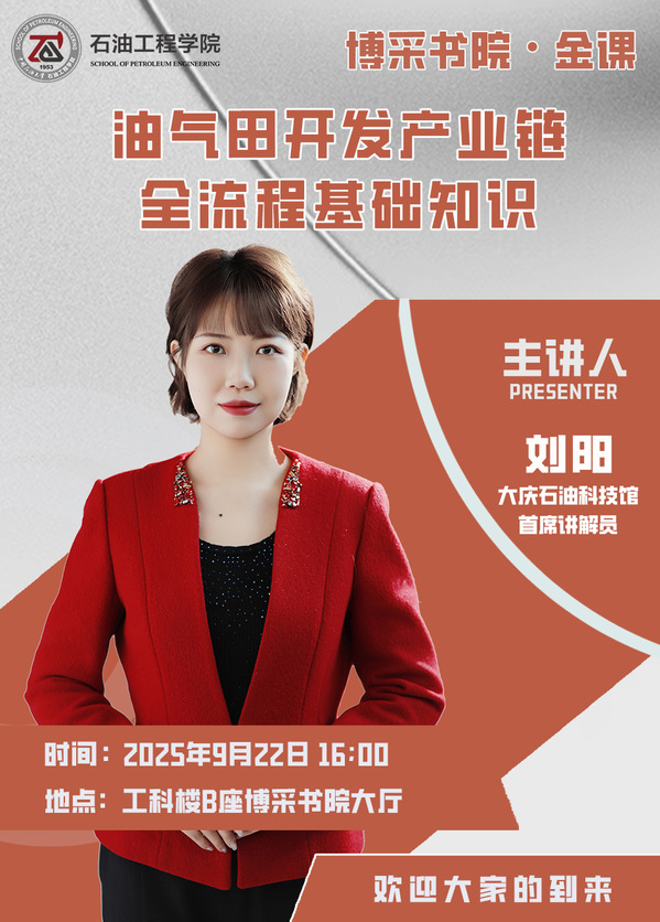 【本站讯】为助力公司2025级本科新生深入了解石油工业发展史,9月22日,学院特邀来自大庆石油科技馆的首席讲解员刘阳在工科B座大厅为同学们带来“油气田开发产业链全流程基础知识”讲座。