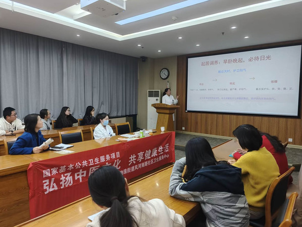 活动伊始,徐燕蕾以《黄帝内经》理论为依据,深入阐述冬季“藏”阳气的核心养生原则,强调冬季保养对于固护人体阳气、奠定健康基础的重要性。她结合中医藏象理论,系统讲解冬季保养与肾脏健康的关系,以及肾精充足对人体的关键作用。围绕“藏”的原则,徐燕蕾从起居、饮食、运动、经络穴位、调养及特色疗法等多个维度,详细介绍冬季养生的具体方法。她建议参会师生遵循“早卧晚起,必待日光”的作息,选择温润、益肾的饮食,进行八段锦、散步等和缓运动,并通过艾灸、穴位按摩等方式增强体质。徐燕蕾还分享多个临床调理案例,生动展示了中医药在治未病、调理亚健康方面的独特优势,并详细解答参会师生的提问。