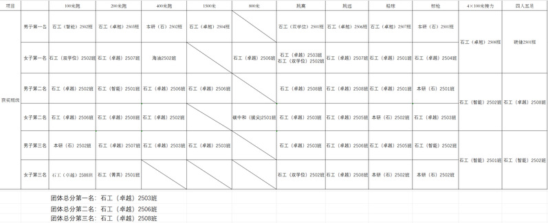经过激烈的角逐,石工(卓越)2503班获得团体总分第一名。盖板员工代表王晨感慨地说:“在前期的训练中,有人刚下早读就去操场联系,女生陪男生慢跑热身,男生帮助女生搬器材。比赛时,看台座位不够,全班就围成一圈站着喊加油。比赛的奖项是额外的收获,真正难得的是我们一起拼搏过地经历。”