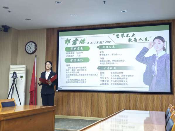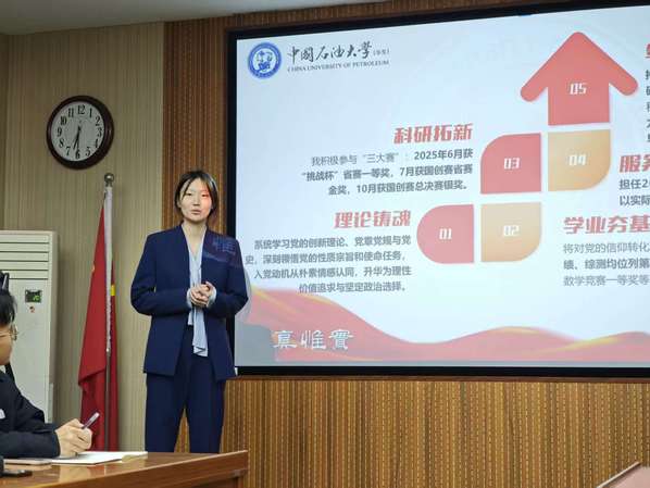 汇报会伊始,张家馨结合石油行业“艰苦奋斗、无私奉献” 的优良传统与新时代党员的责任使命,向本次参与汇报的全体发展对象提出明确要求。并强调,发展对象作为青年中的先进分子,既要在学业科研中勇攀高峰,更要在日常学习生活中主动践行奉献精神,立足校园、辐射社会,以实际行动诠释对党的忠诚与担当,在服务同学、奉献集体中锤炼党性修养,展现石油学子的责任与风采。