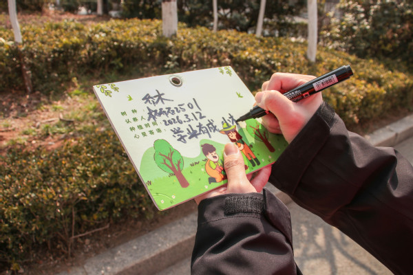 活动伊始,在园艺人员的专业指导下,学员们迅速分组协作、各司其职。大家严格遵循“挖坑、放苗、填土、踩实、浇水”的规范流程,有条不紊地开展操作:有的挥锹挖坑、有的扶苗定位、有的培土压实、有的提桶浇水,每一个环节都认真细致,用双手践行劳动使命,用汗水浇灌绿色希望。植树间隙,树牌制作环节同步开展。学员们结合专业特色与生态理念,精心设计制作树牌。树牌上不仅标注了树苗的科学信息,更印有“石油青年守初心,绿水青山伴我行”“植绿护绿,青年先行”等励志标语,每一块树牌都凝聚着青年骨干的美好期盼,彰显着石油青年的使命与担当。待树苗栽种完成,学员们将树牌挂于枝干,为新苗赋予专属“身份”,也让护绿责任更加具象化。